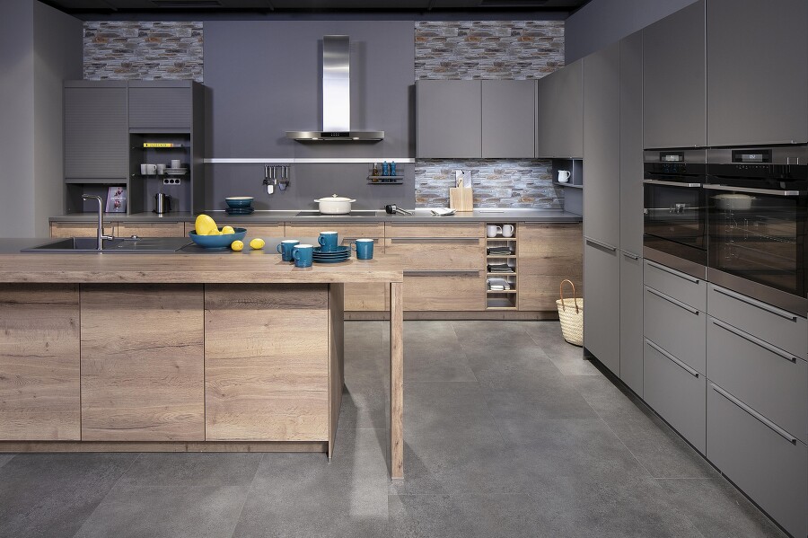 Es liegt im Trend, abseits der bekannten Pfade zu wandeln, und dazu gehören auch Materialkombinationen. Wir interpretieren dies mit einer Küche in hellem Grau an Ober- und Hochschränken, gepaart mit ausdrucksstarker Eichen-Optik im Unterschrankbereich.